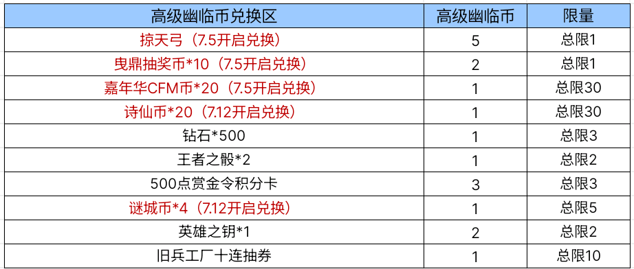 众所周知,每期宝库活动都有超值加购区,本期幽临城下宝库自然不例外。不过本期宝库的超值加购道具比较神秘,需要在7月15日揭晓。而常规的高级幽临币兑换区有掠天弓、曳鼎抽奖币、嘉年华CFM币、诗仙币等珍贵道具,成功邀请10名6月未登录好友可刷新1次兑换上限,请大家自行预览兑换内容。