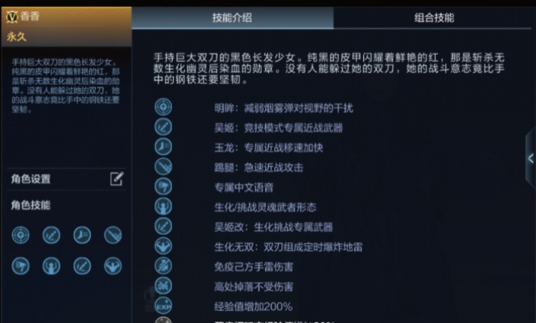 香香在竞技模式中具有专属近战武器,手持专属近战武器移速加快,香香在爆破模式中使用MK47-仁德时将触发联姻组合技能:视野中出现敌人可触发心跳声提示;在生化模式中具有专属武器,她的双刃可以组成定时爆炸地雷,在进化为终极猎手时,可选择变身香香,伤害、形态以及使用武器上都得到更大提升。