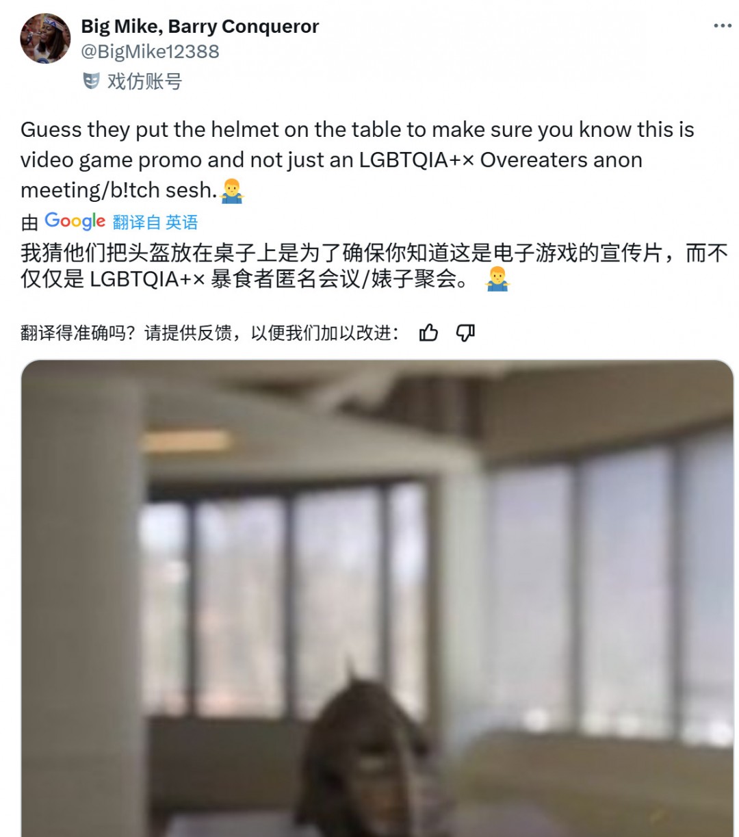 “贝塞斯达把头盔摆在桌上,可能是为了提醒玩家这是在宣传电子游戏,而不仅仅是LGBTQIA+与暴食者匿名协会的联合会议或一场Bitch派对。”