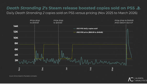 此外,《死亡搁浅2》登陆PC也已进一步拉动了PS5版的销量。索尼为了配合游戏登陆Steam而进行了降价促销,让游戏在PS5上的销量在3月19日之后翻了一番多,平均每天售出1.25万,最高销量达到1.28万。