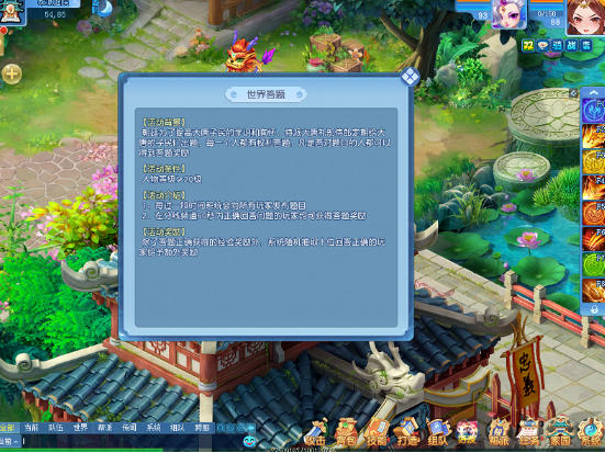 少侠在畅游江湖之余,不妨多留意一下聊天频道的消息,说不定就能撞见礼部侍郎提出的问题。若心中有数,只需以最快速度将答案敲在世界频道并发送出去即可。答题时间限时一分钟,过时不候,手速同样关键。