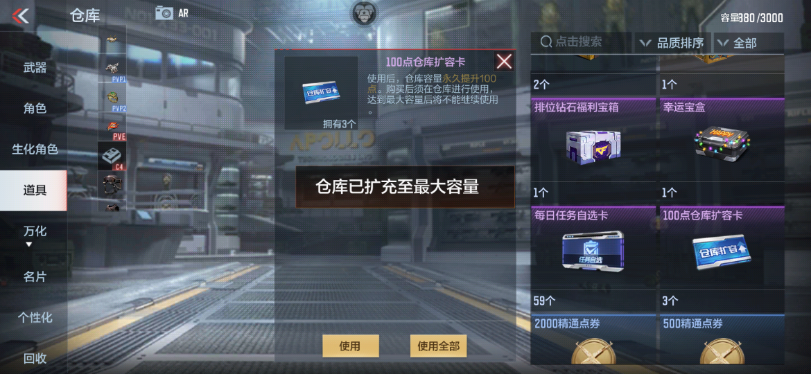 每使用1张仓库扩容卡,可为你扩充100点仓库容量,仓库容量的上限为3000点,到达上限之后便无法扩充。拿下盛典登录礼赠送的1张仓库扩容卡之后,又可以收取满满的福利啦!