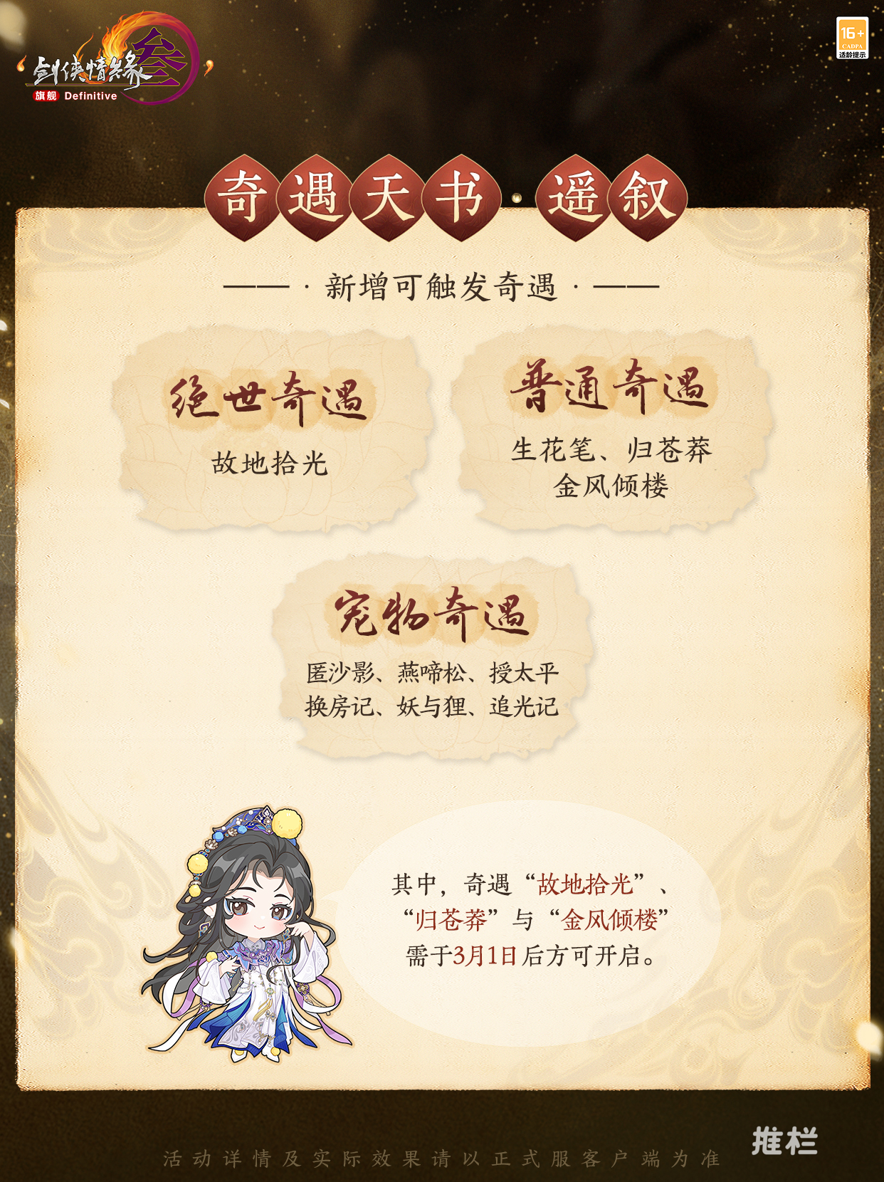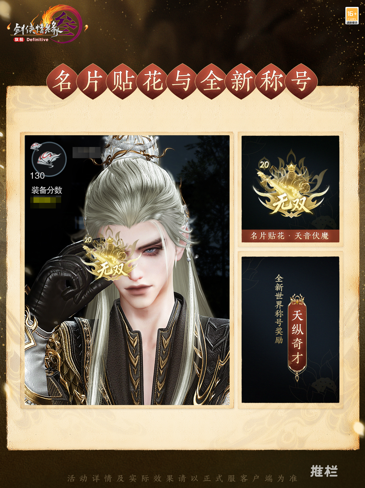 与此同时,还有专属名片贴花“天音伏魔”与世界称号“天纵奇才”展现无双气魄,奇遇天书“遥叙”新增多个可触发奇遇,江湖路迢遥,且整行装再策马!