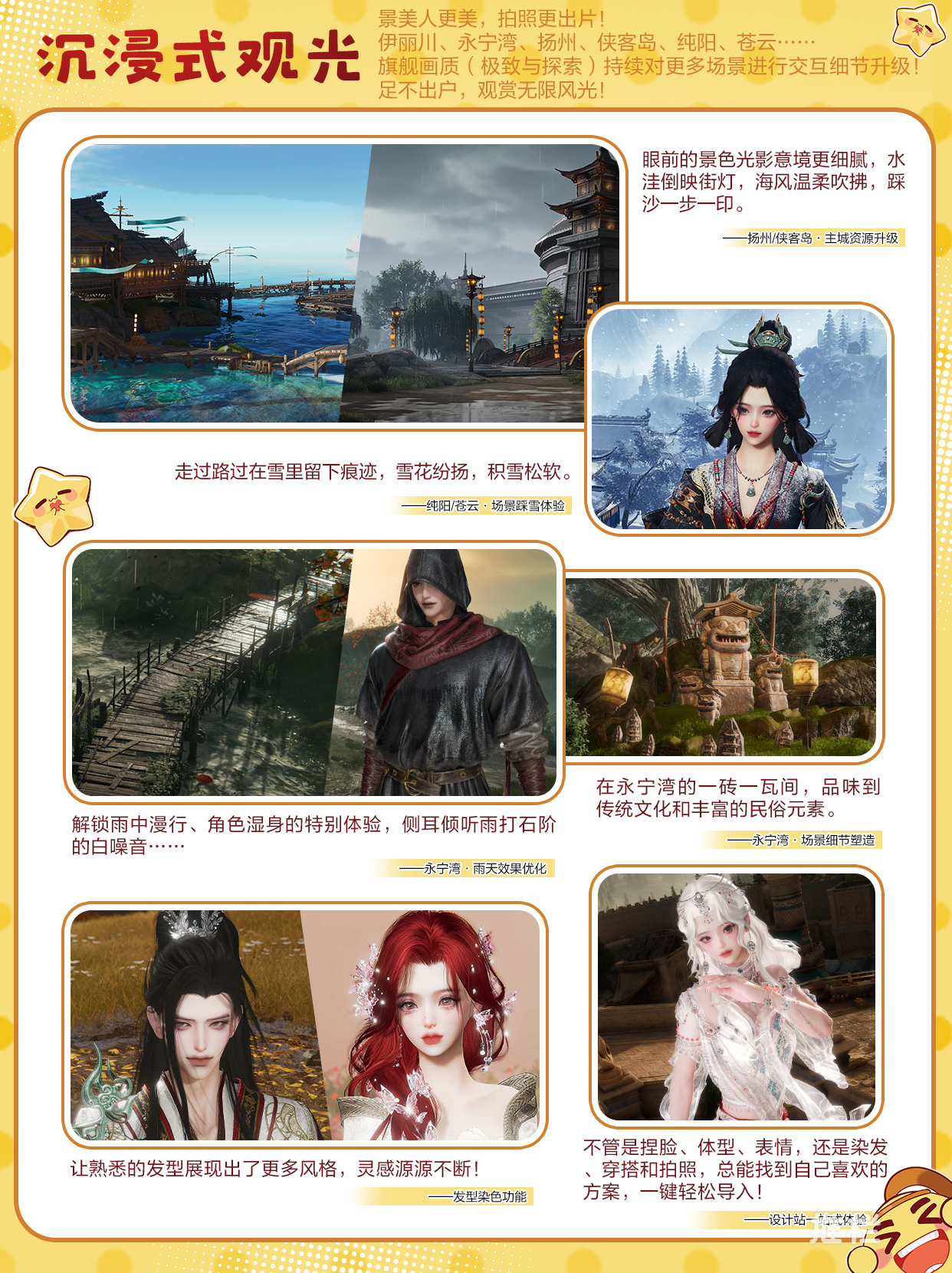 场景方面,保留了玩家喜爱的大视野、大地图、大视距的独特设定,并通过技术革新持续提升表现力。永宁湾的唯美意境和伊丽川的多样风光得到肯定后,旧地图也在持续量产革新,并将在新赛季完成4主城和全门派的画质升级。升级规格也超过了旗舰画质beta,建模和贴图都进行了大规模替换,旨在给侠士呈现一个与时俱进的大唐世界。