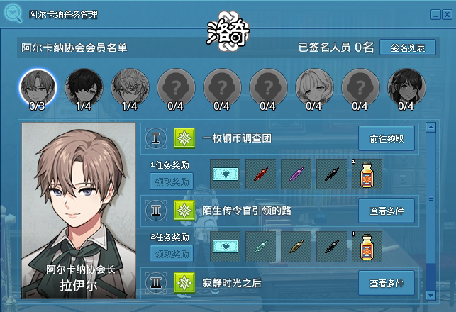 满足两个条件后以[阿尔卡纳协会的日常]与拉伊尔对话来领取任务。