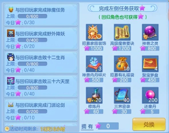 和好友建立招募关系,参与日常活动,均可获得回归积分!使用积分可获得永久家园装扮,高级兽诀、神兽之灵等奖励!